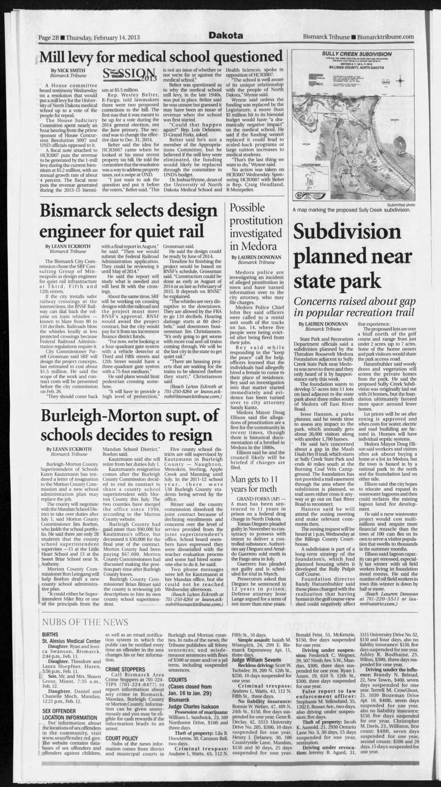 - “Possible Prostitution Investigation in Medora”, Bismarck Tribune, February 14 2013.