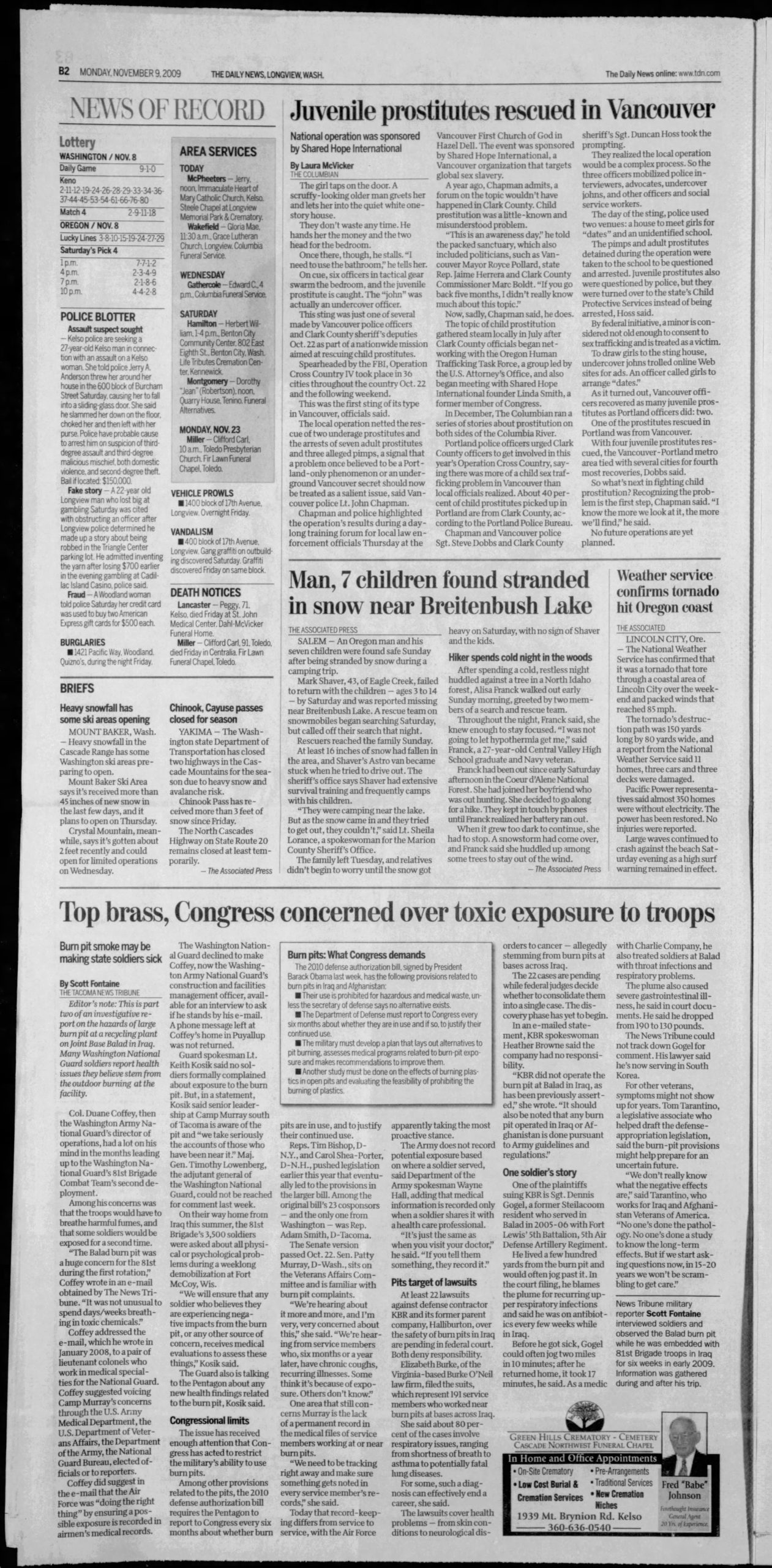 - “Prostitution Sting Yields 14 Arrests, Two Rescues”, Vancouver Columbian, November 8 2010.