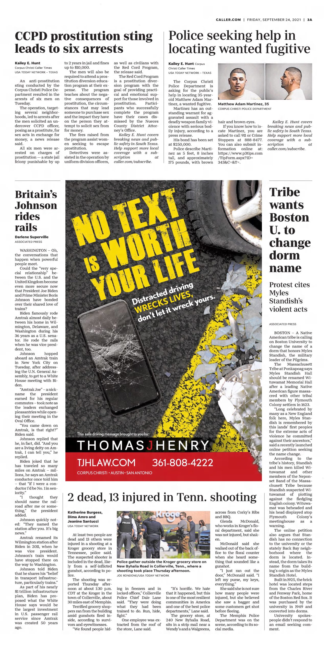 - “Corpus Christi police arrest six johns during prostitution sting operation.” Caller Times, March 30, 2018.