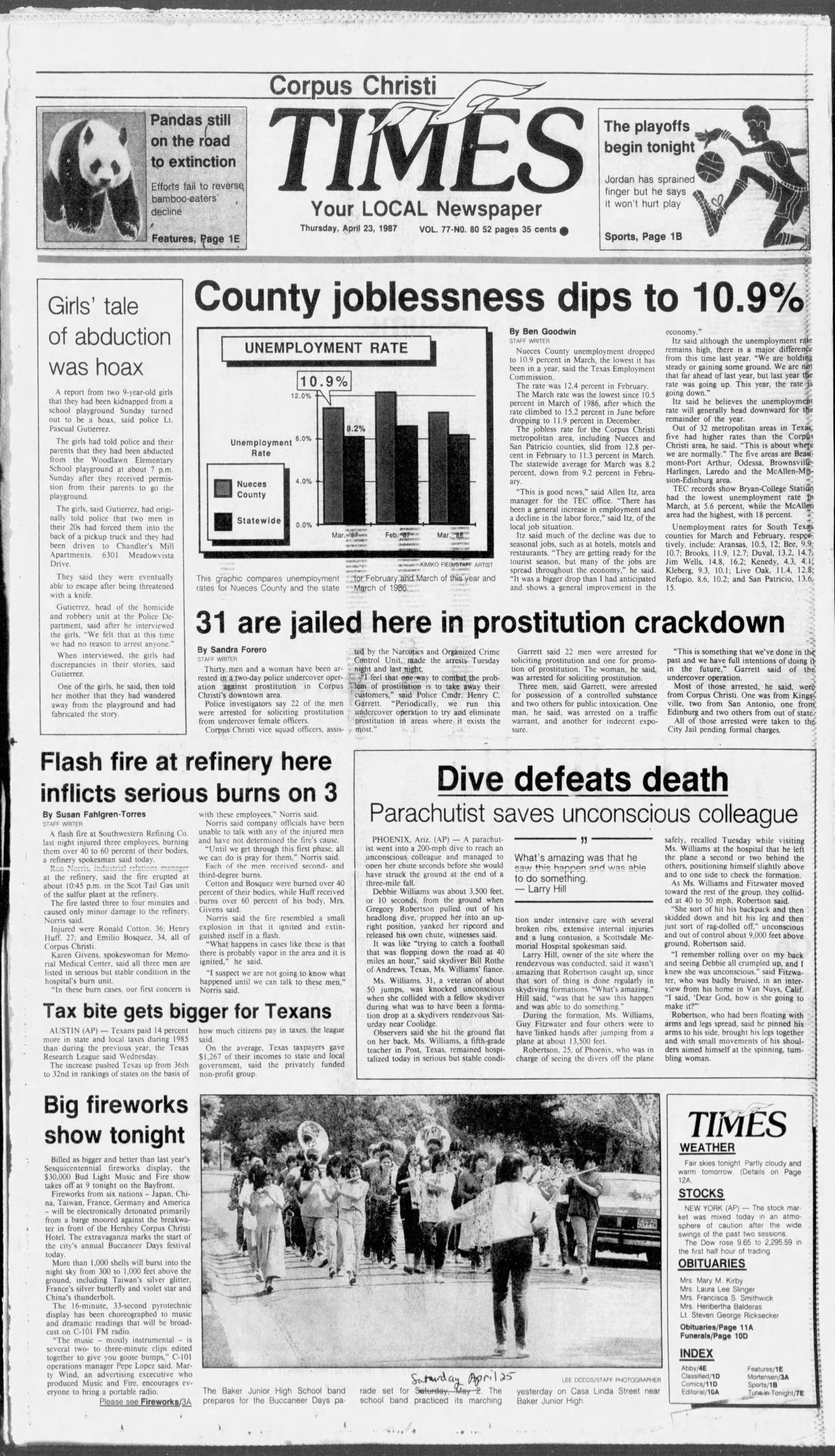 - “Prostitution Sting Nets Cops 16 Arrests”, Corpus Christi Caller-Times, July 8 2000.