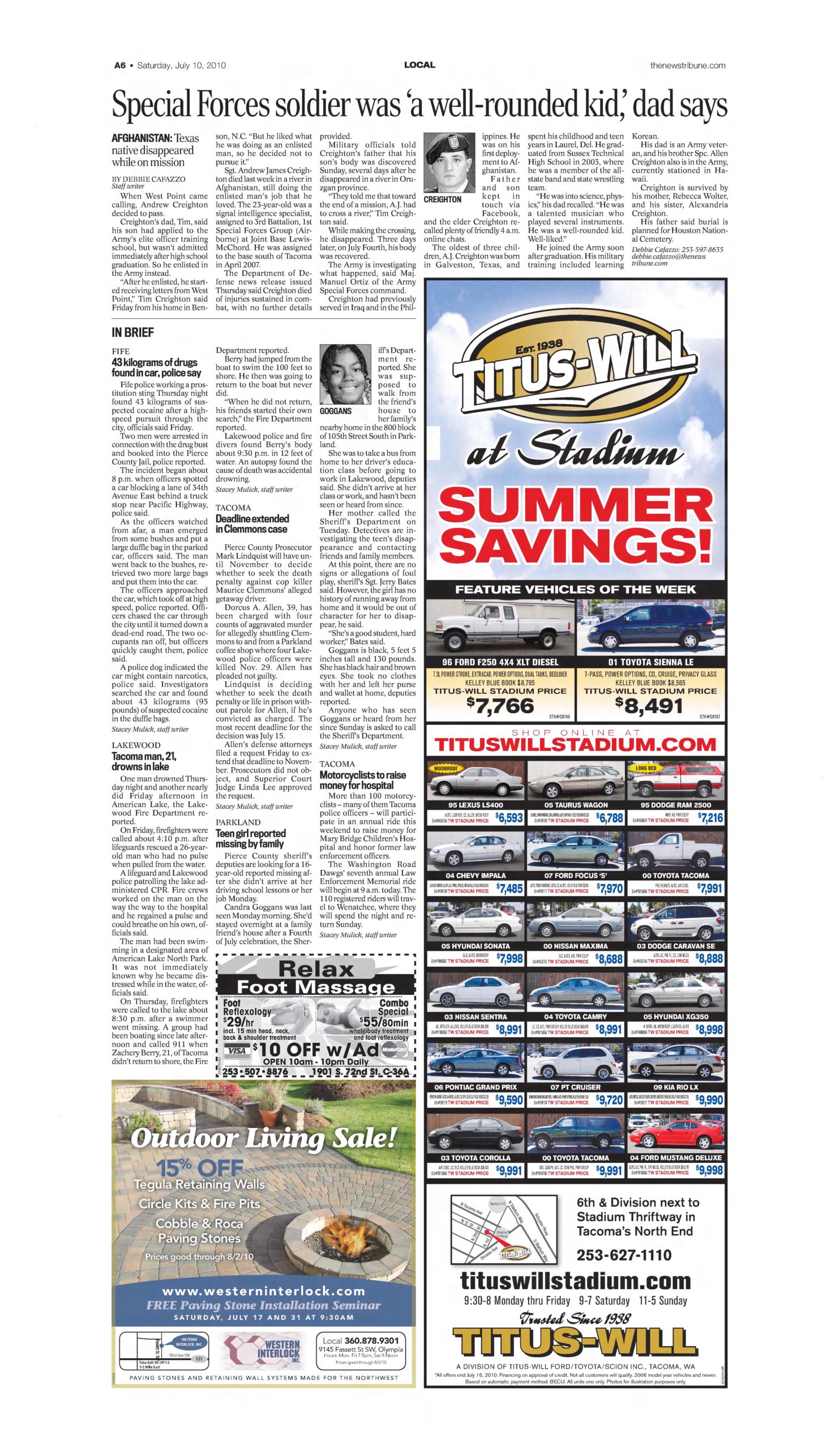 - “Fife: 43 Kilograms of Drugs Found in Car, Police Say”, Tacoma News Tribune, July 10 2010.