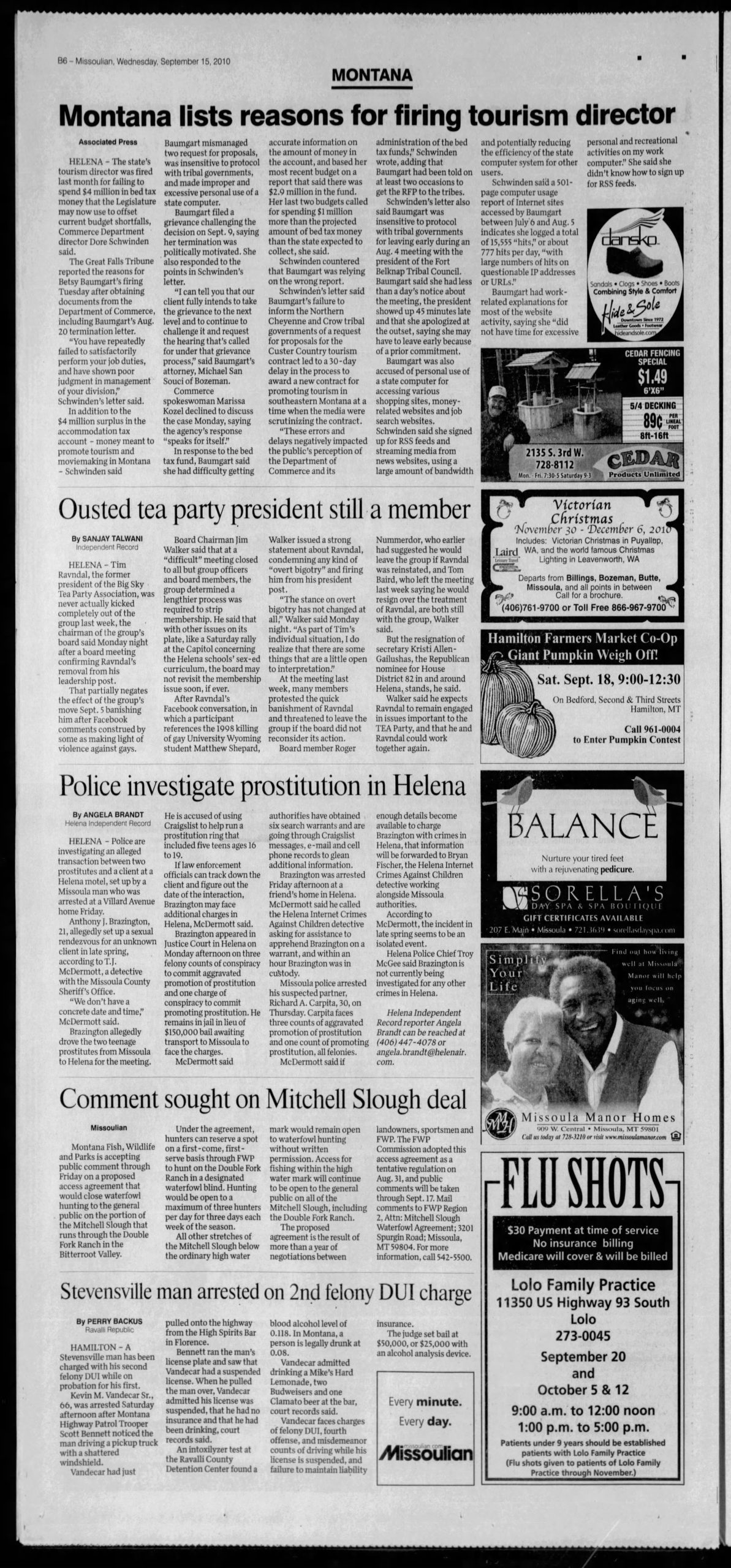 - “Authorities Look into Prostitution Case in Helena,” Helena Independent Record, September 15 2010.