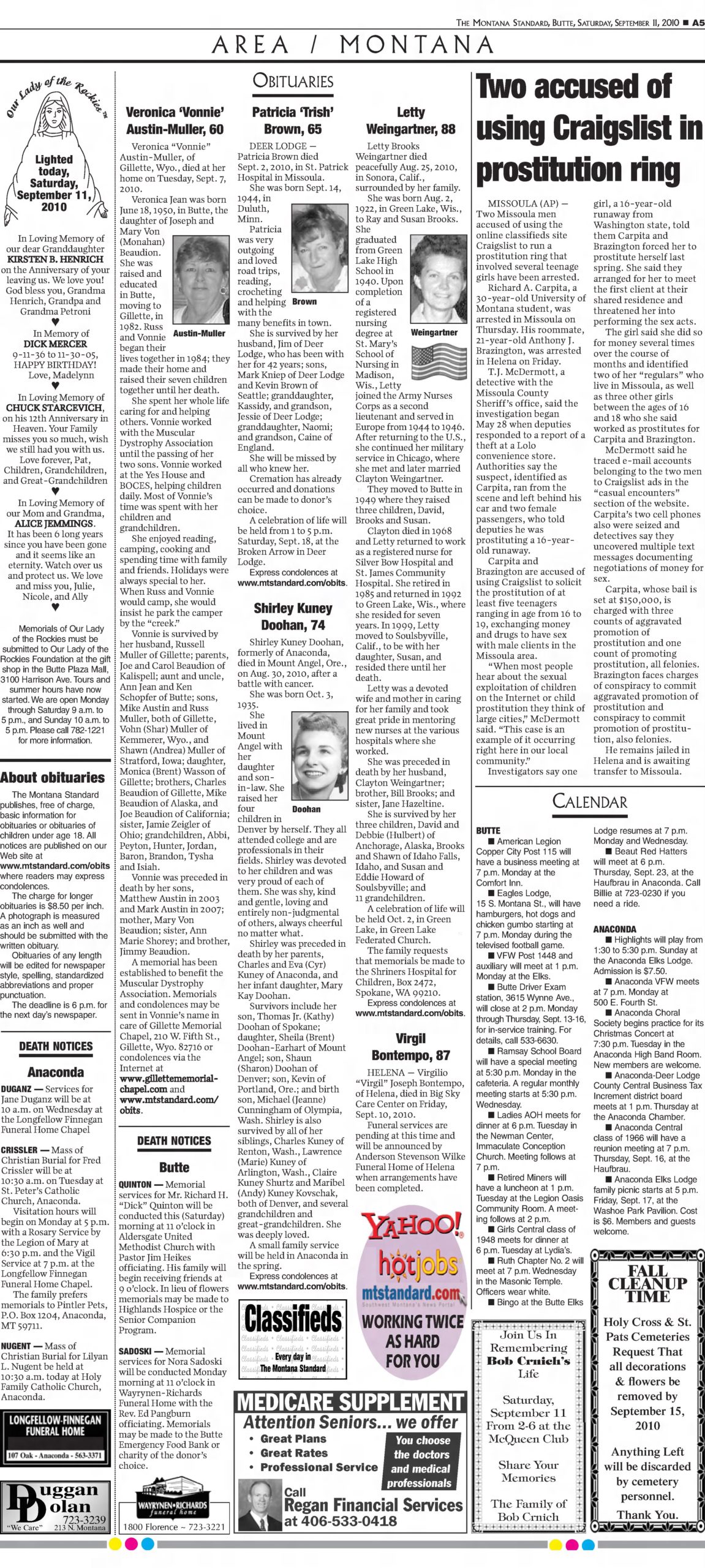 - “Police Probe Teen Prostitution Ring,” Helena Independent Record, September 14 2010.