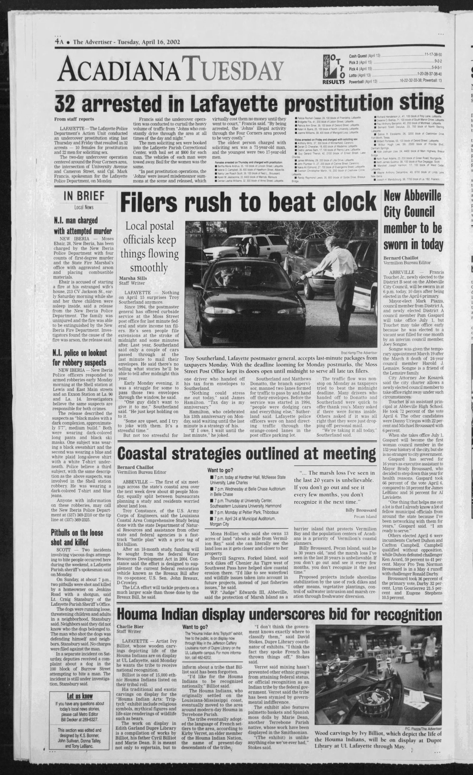 - “Lafayette Police Arrest 19 on Prostitution Charges”, Lafayette Daily Advertiser, May 19 2003.