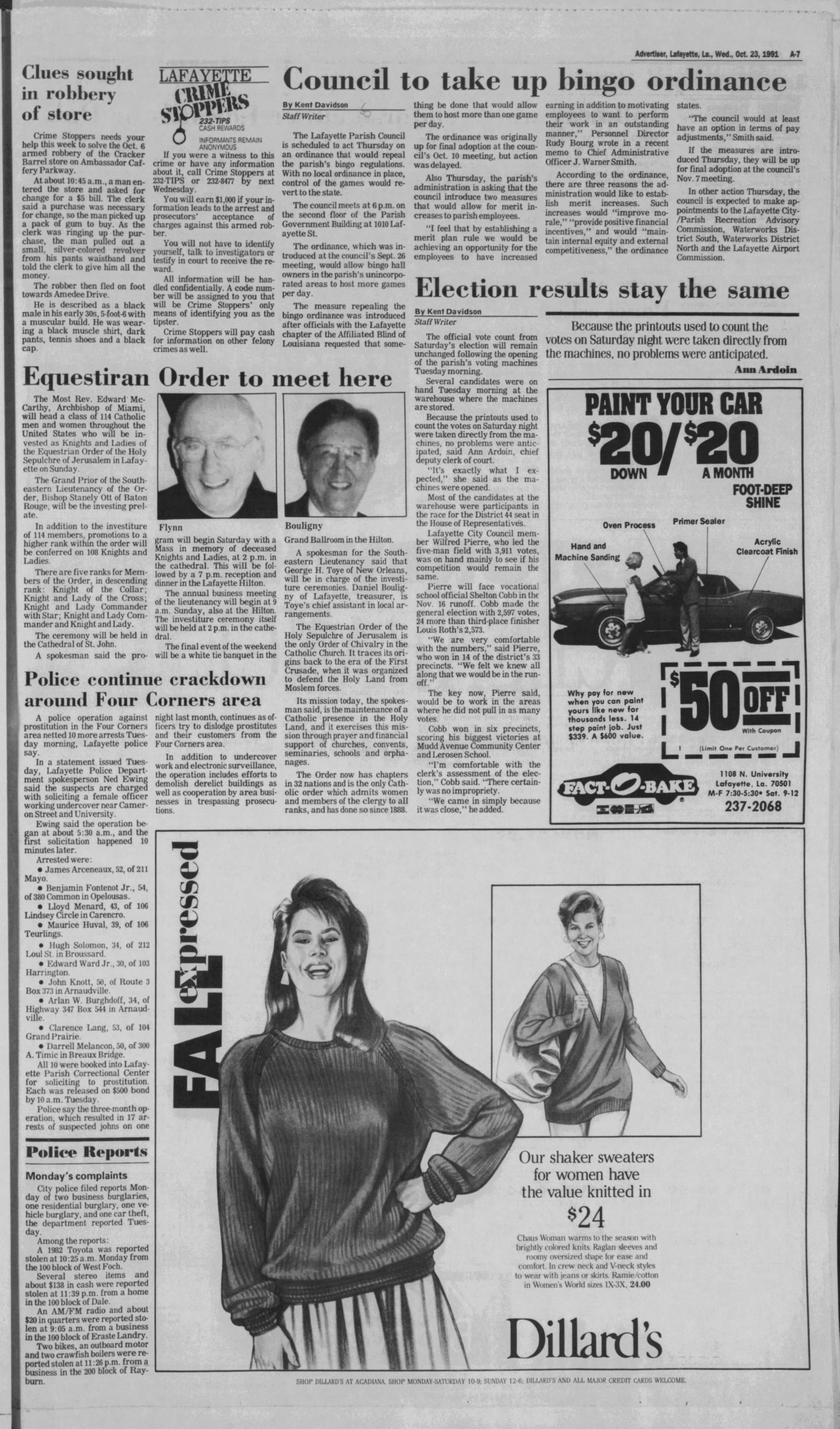 - “Ten Arrested for Solicitation in Lafayette Sting Operation”, Baton Rouge Advocate, October 23 1991.