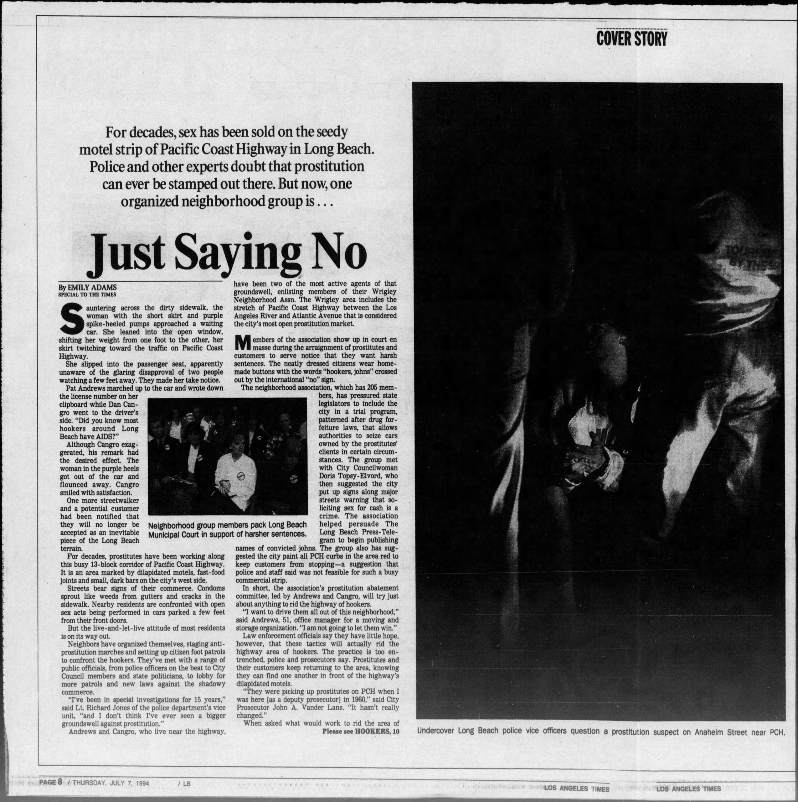 - “LONG BEACH: City Adopts New Law to Fight Prostitution”, Los Angeles Times, August 11 1994.