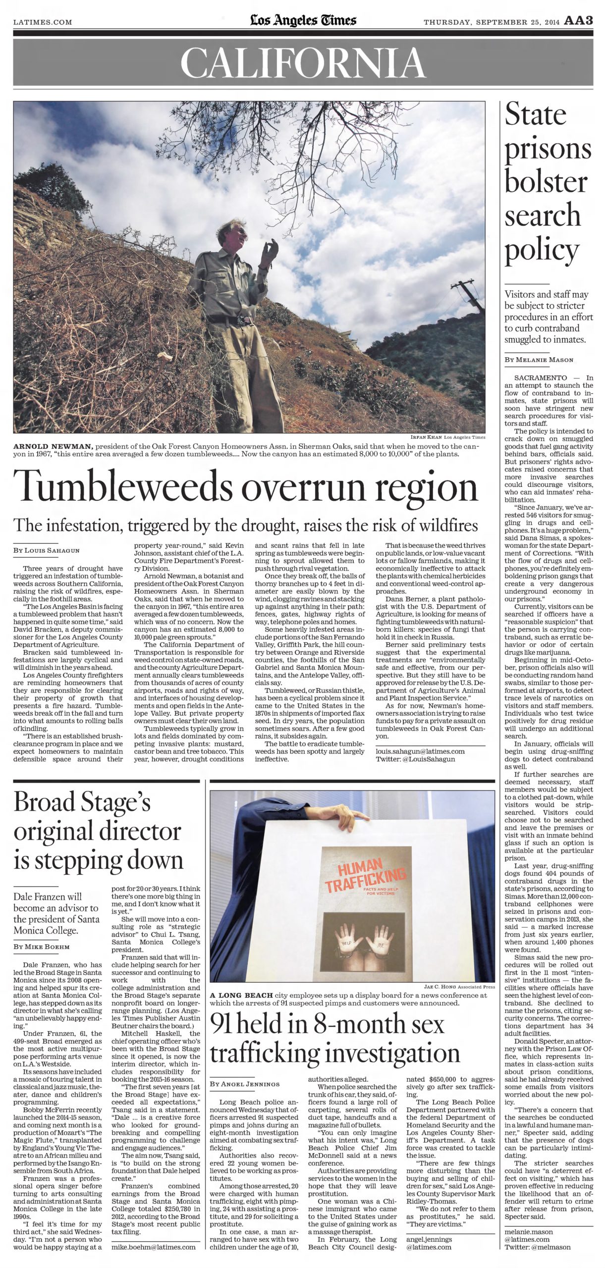 - “Big Prostitution Bust Nabs 91 Alleged Pimps, Johns”, Los Angeles Times, September 24 2014.