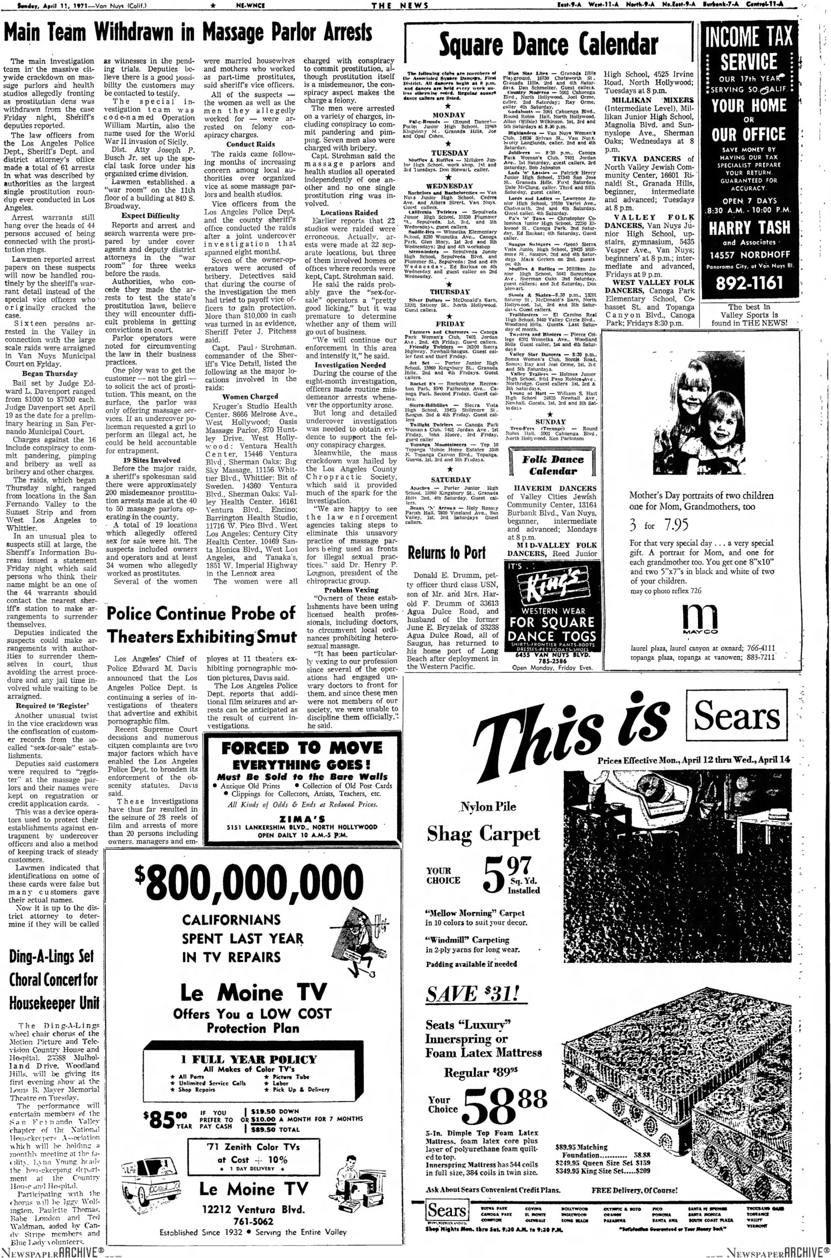 - Largest prostitution operation to date, 22 massage parlors raided (1971)