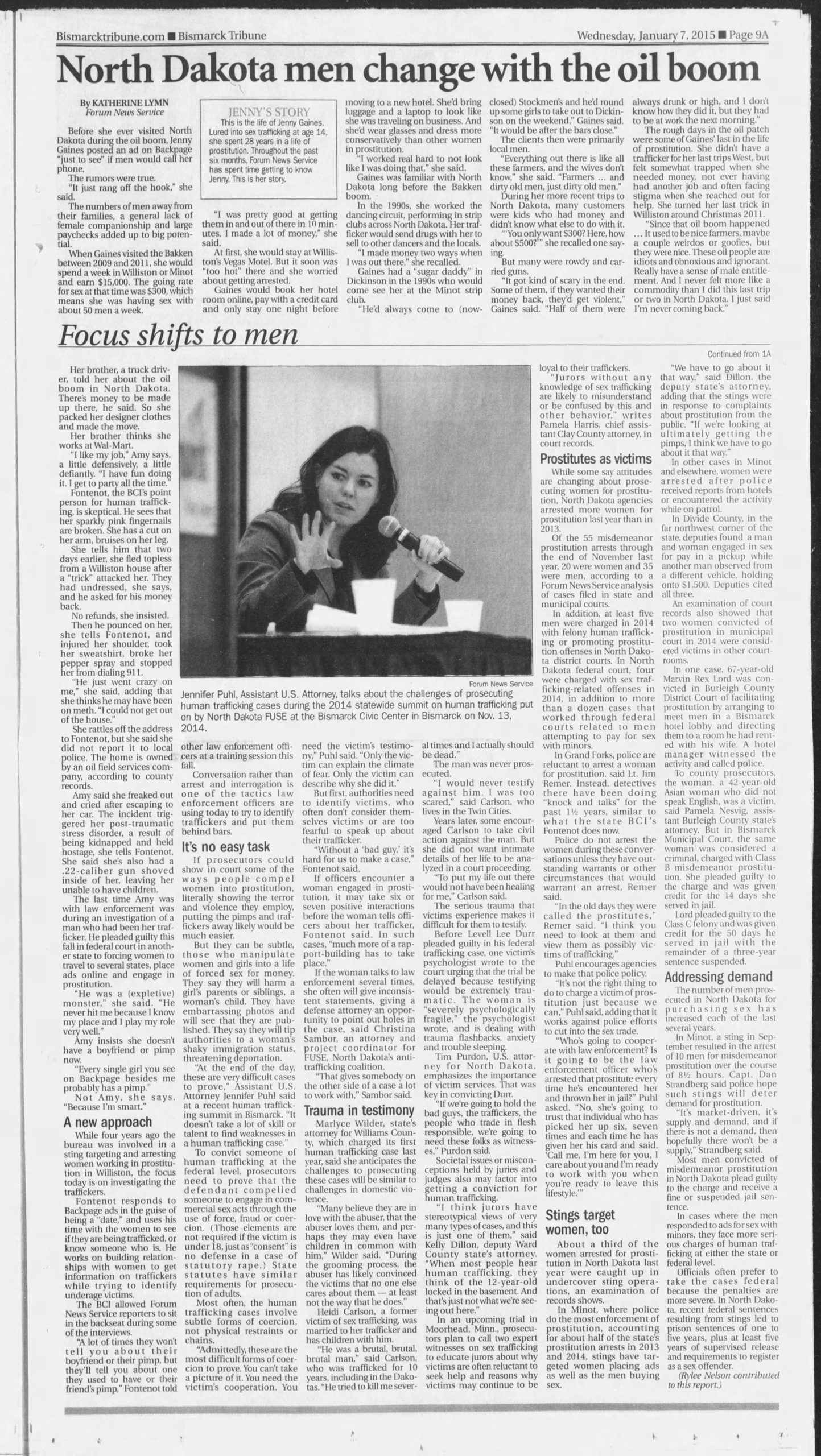 - “Two Charged with Luring Women to Work in N.D. Brothels,” Bakken Today, September 24 2014.